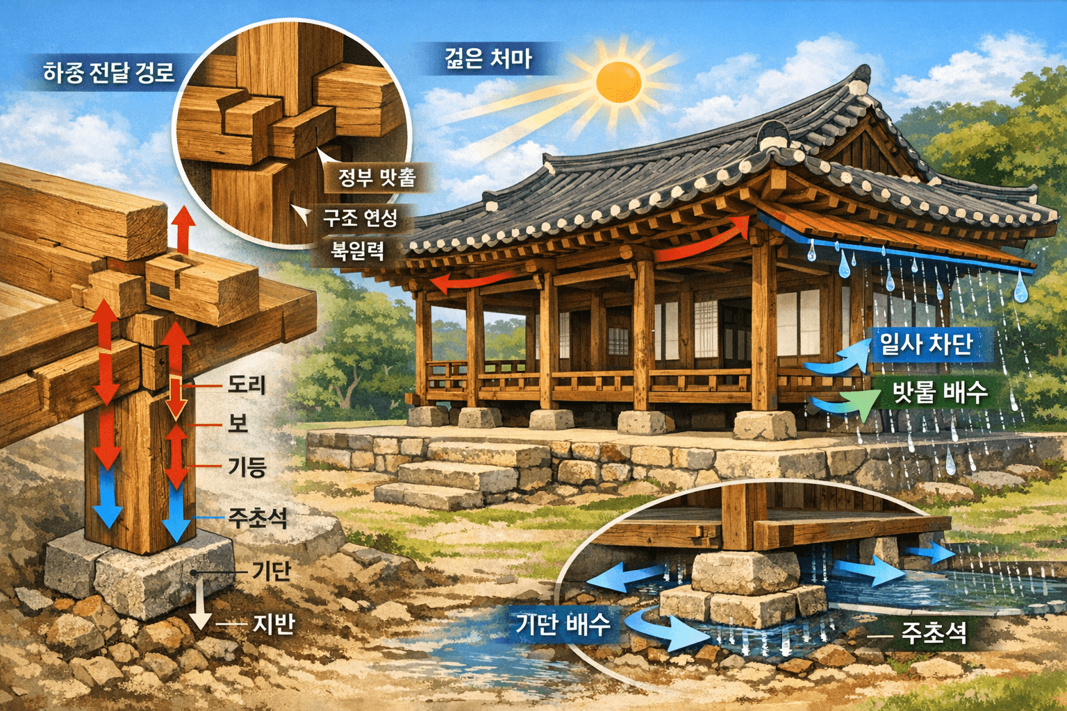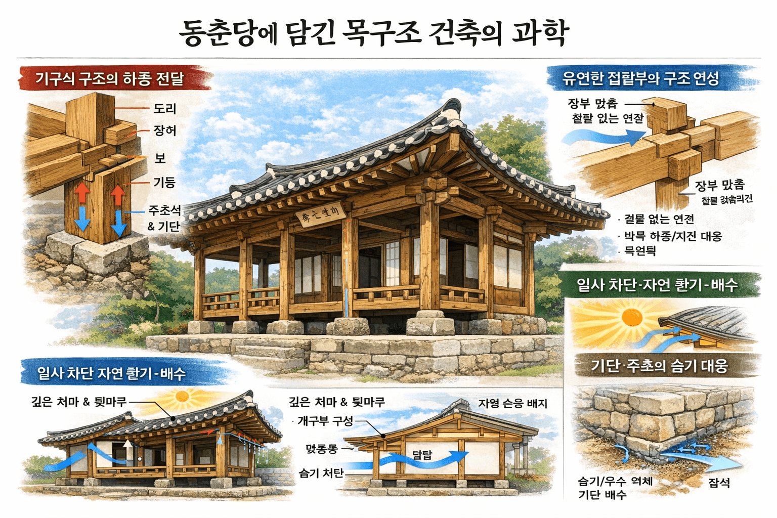 동춘당은 가구식 목구조의 기본 원리가 명확하게 드러나는 건물로, 하중이 지붕→보·도리→기둥→주초·기단→지반으로 전달되는 경로가 읽힌다. 기둥과 보의 맞춤·장부 접합은 못이나 철물 의존을 줄이면서도 반복 하중에 대한 연성과 복원력을 확보하는 전통적 구조 해법이다. 처마는 단순 장식이 아니라 강우를 외벽에서 멀리 떨구고 일사를 차단하는 ‘외피 성능 장치’이며, 동시에 캔틸레버 하중을 지지하는 구조 요소이기도 하다. 기단과 주초는 지면 습기로부터 목재를 이격시키고 배수 조건을 확보해 내구성에 직접 기여한다. 결과적으로 동춘당의 안정성은 과도한 재료량이 아니라, 부재 배치·접합·하중 경로의 명료함에서 나온다. 환경 제어 측면에서 동춘당은 툇마루와 깊은 처마로 ‘완충 공간’을 만들고, 이는 실내로 유입되는 열과 습의 변동을 완만하게 만든다. 개구부의 구성은 계절에 따라 바람길을 조절할 수 있어 자연환기 성능을 높이고, 체감 쾌적을 확보하는 데 유리하다. 지형을 거스르지 않는 배치는 토공을 최소화하면서도 우수의 흐름을 자연스럽게 흘려 보내 구조적·환경적 리스크를 동시에 낮춘다. 이런 방식은 현대 건축공학의 관점으로 보면, 에너지 설비에 의존하기 전에 형태·디테일로 성능을 먼저 확보하는 ‘패시브 설계’의 전형이다. 따라서 동춘당은 전통 건축을 미학으로만 보지 않고, 구조·환경·유지관리의 통합 시스템으로 읽을 때 공학적 가치가 더 분명해진다.